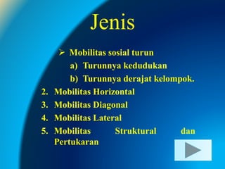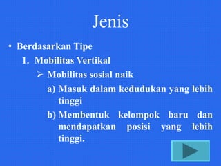 Bentuk Mobilitas Sosial Berdasarkan Ruang Lingkup. Mendorong seseorang untuk lebih maju. Horton diartikan sebagai gerak perpindahan dari satu kelas sosial ke kelas sosial lainnya atau gerak pindah dari strata satu ke strata lainnyaKehidupan di masyarakat tidaklah sama.